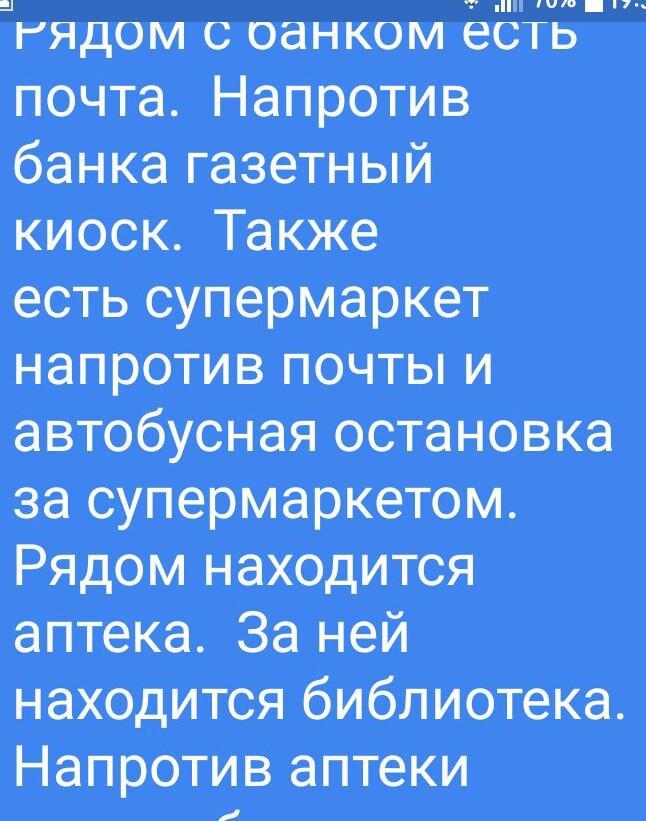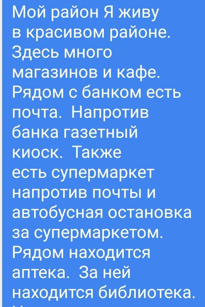 Мой район Я живу в красивом районе. Здесь много магазинов и кафе. Рядом с банком есть почта. Напротив банка газетный киоск. Также есть супермаркет напротив почты и автобусная остановка за супермаркетом. Рядом находится аптека. За ней находится библиотека. Напротив аптеки моя любимая кофейня! Мне очень нравится мой район! вот держи ответ