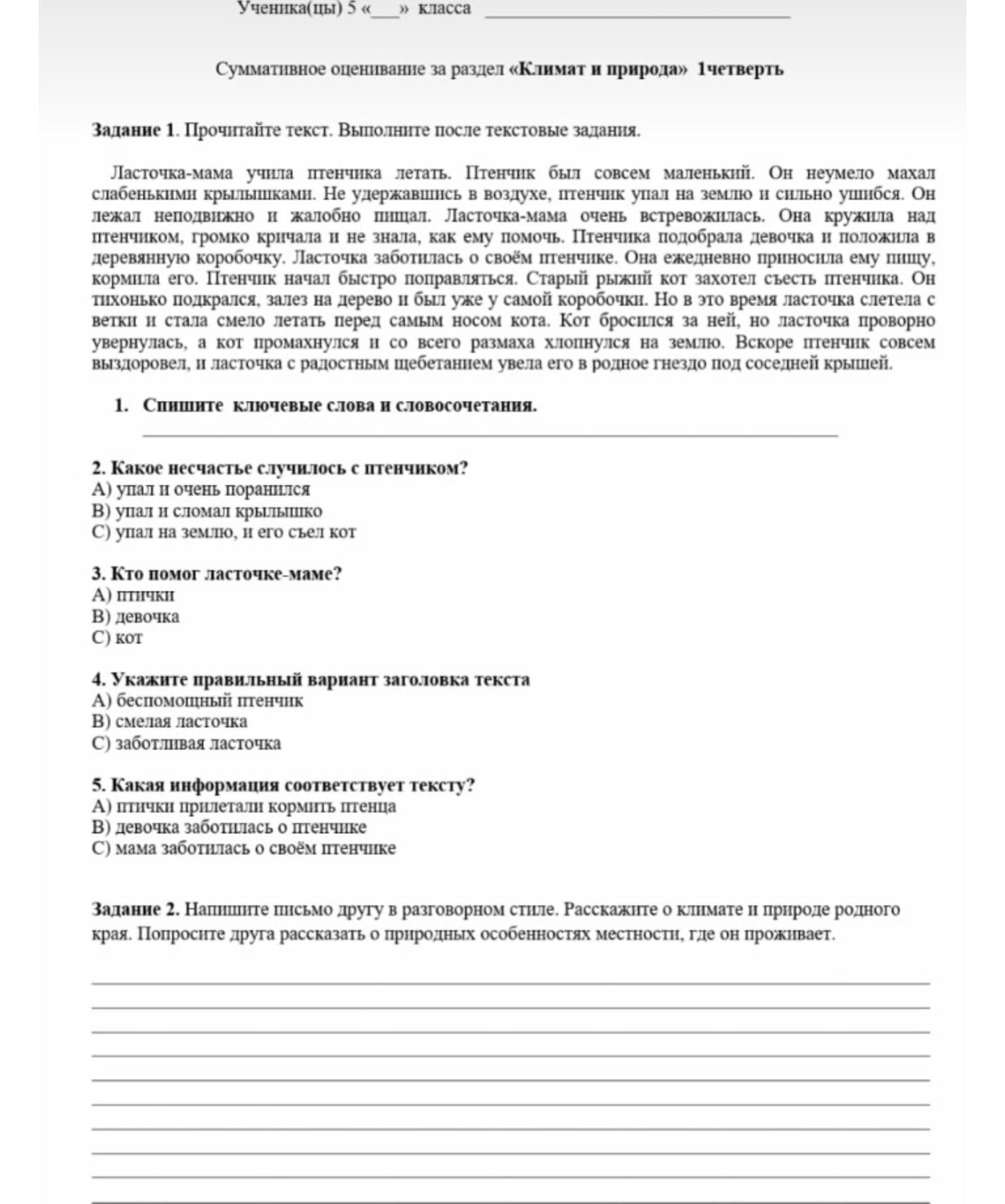 Ученика(цы) 5 класса Суммативное оценивание за раздел «Климат и природа» 1четверть Задание 1. Прочитайте текст. Выполните после текстовые задания. Ласточка-мама учила птенчика летать. Птенчик был совсем маленький. Он неумело махал слабенькими крылышками. Не удержавшись в воздухе, птенчик упал на землю и сильно ушибся. Он лежал неподвижно и жалобно пищал. Ласточка-мама очень встревожилась. Она кружила над птенчиком, громко кричала и не знала, как ему помочь. Птенчика подобрала девочка и положила в деревянную коробочку. Ласточка заботилась о своём птенчике. Она ежедневно приносила ему пищу, кормила его. Птенчик начал быстро поправляться. Старый рыжий кот захотел съесть птенчика. Он тихонько подкрался, залез на дерево и был уже у самой коробочки. Но в это время ласточка слетела с ветки и стала смело летать перед самым носом кота. Кот бросился за ней, но ласточка проворно увернулась, а кот промахнулся и со всего размаха хлопнулся на землю. Вскоре птенчик совсем выздоровел, и ласточка с радостным щебетанием увела его в родное гнездо под соседней крышей. 1. Спишите ключевые слова и словосочетания. 2. Какое несчастье случилось с птенчиком? A) упал очень поранился B) упал и сломал крылышко C) упал на землю, и его съел кот 3. Кто помог ласточке-маме? A) птички B) девочка C) кот 4. 4. Укажите правильный вариант заголовка текста A) беспомощный птенчик B) смелая ласточка C) заботливая ласточка 5. Какая информация соответствует тексту? A) птички прилетали кормить птенца B) девочка заботилась о птенчике C) мама заботилась о своём птенчике Задание 2. Напишите письмо другув разговорном стиле. Расскажите о климате и природе родного края. Попросите друга рассказать о природных особенностях местности, где он проживает.