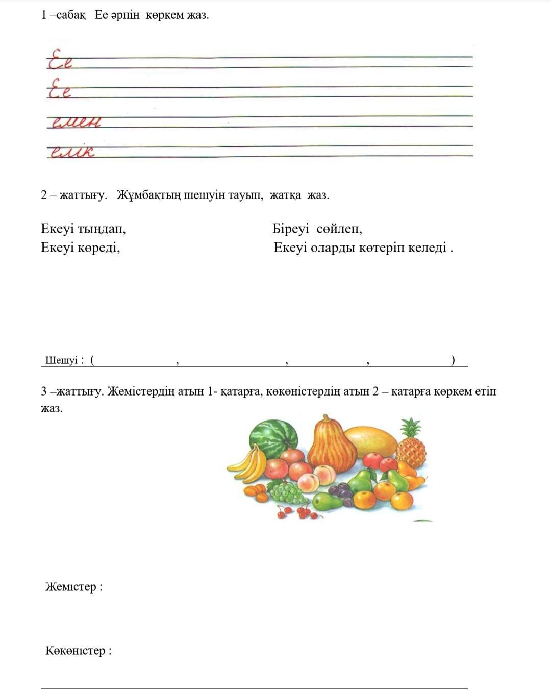 Жемістер: банан, жүзім,алмұрт,алма,ананас,шие, қарбыз,қауын,шабдалы,өрік