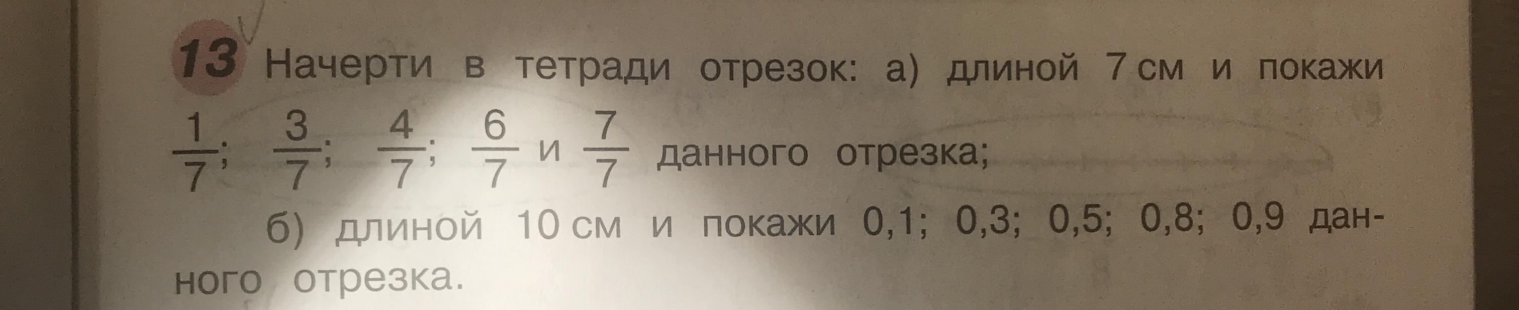 Начерти в тетради отрезок: длиной 7 см и покажи 1/7; 3/7; 4/7; 6/7 и 7/7 данного отрезка.