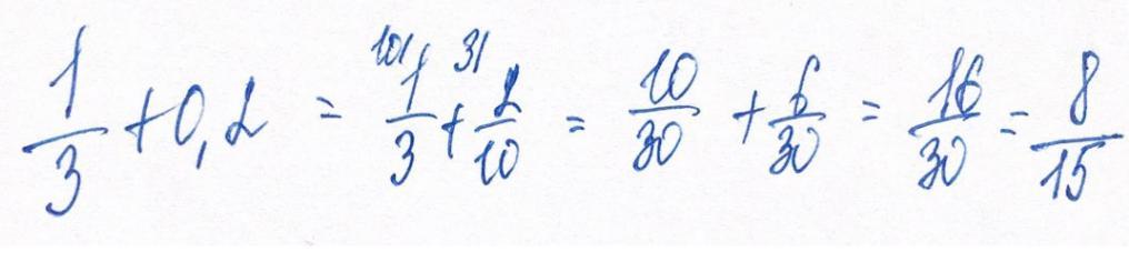 1/3 + 0,2 = 1/3 + 2/10 = 1/3 + 1/5 = (5+3)/15 = 8/15