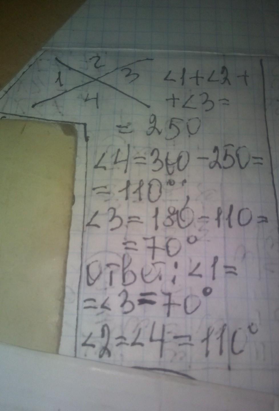 Сума трьох кутів,які утворились при перетинні двох прямих,дорівнює 250 градусів Знайдіть градусі міри всіх утворених кутів