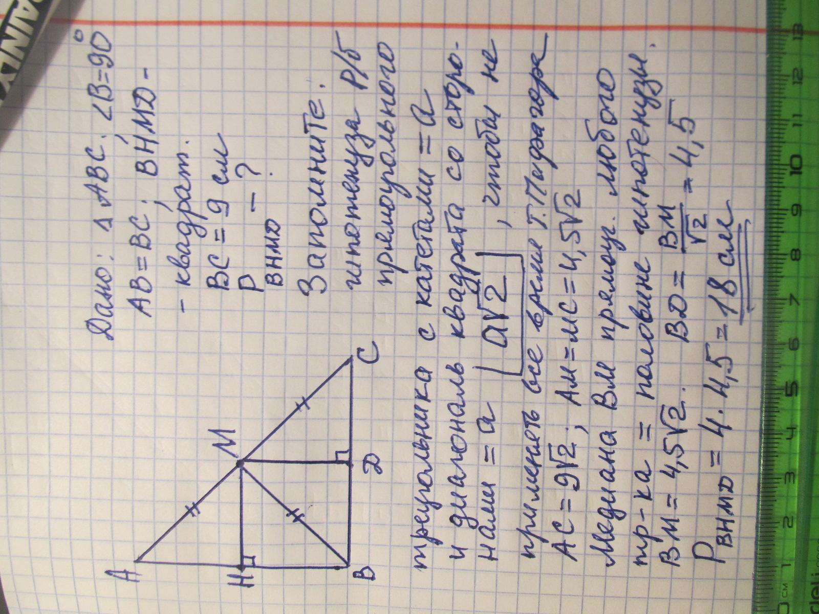 Даны равнобедренный прямоугольный ∆АВС с прямым углом В, катетом ВС = 9 см и квадрат BKMN такой, что две его стороны лежат на катетах, а вершина М – на гипотенузе треугольника. Найдите периметр квадрата.
