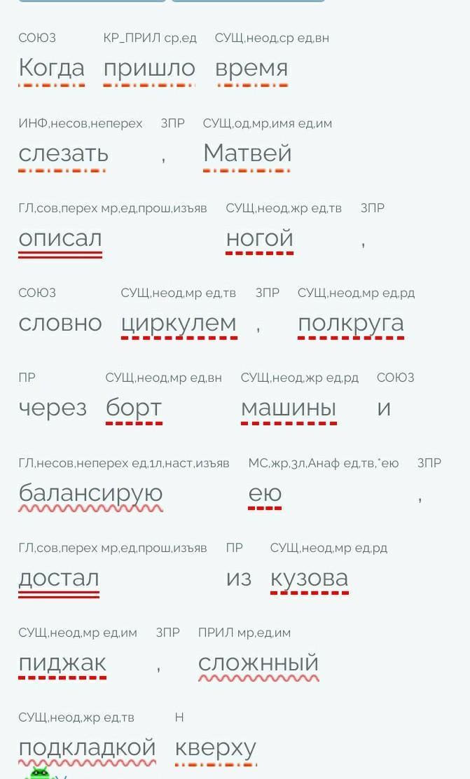 Посогите !!! Даю 10 баллов нужно сделать синтаксический разбор предложении.Когда пришло время слезать,Матвей описал ногой,словно циркулем,полкруга через борт машины и балансирую ею,достал из кузова пиджак,сложнный подкладкой кверху