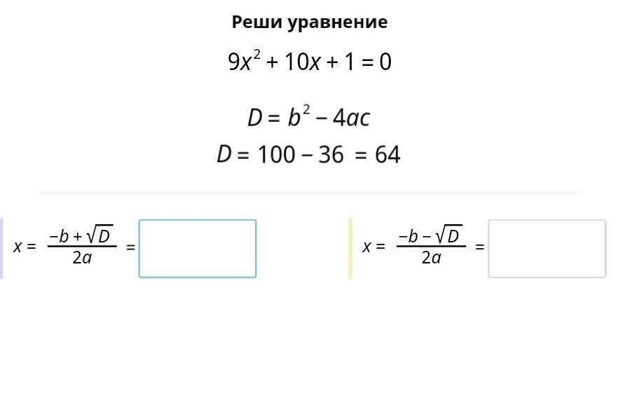 Решили почти все, вам нужно просто подставить в формулу значение. Х1=(-10+√64)/2*9=(-10+8)/18=-2/18=-1/9