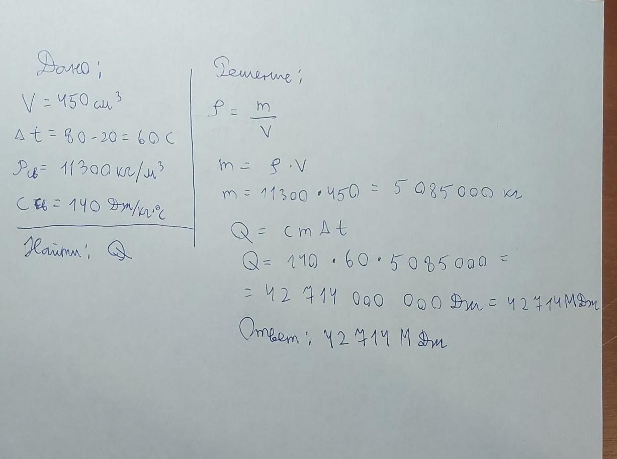 Сколько энергии необходимо для нагревания свинцового бруска объёмом 450см³ от 20 C до 80 C? Плотность свинца 11300 кг/м³