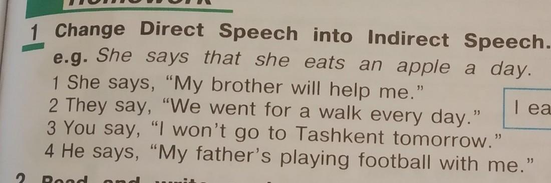 1 She says her brother will help her. 2 They say they went out every day. 3 You say that you will not go to Tashkent tomorrow. 4 He says that his father plays football with him.