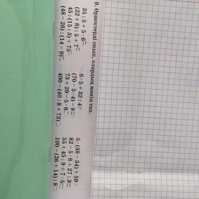 ПЕРВЫМ действием у нас будет 5*7, так как это умножение, оно практически всегда первое, вторым действием идет деление 45:5. Можно сделать наоборот, можно первым действием 45:5, а вторым 5*7, но лучше так не делать. Когда мы прорешаем эти два действия у нас ПОСЛЕДНИМ действием будет 35+9 (прибавление)