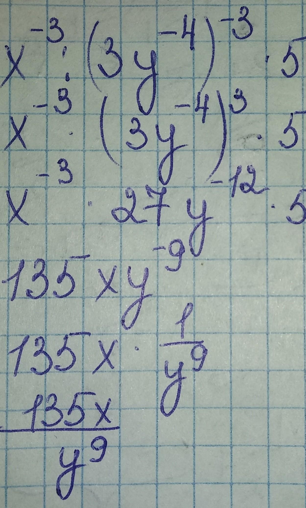(x^(-3)/(3y^(-4) ))^(-3) ꞏ5x^4 y^3
