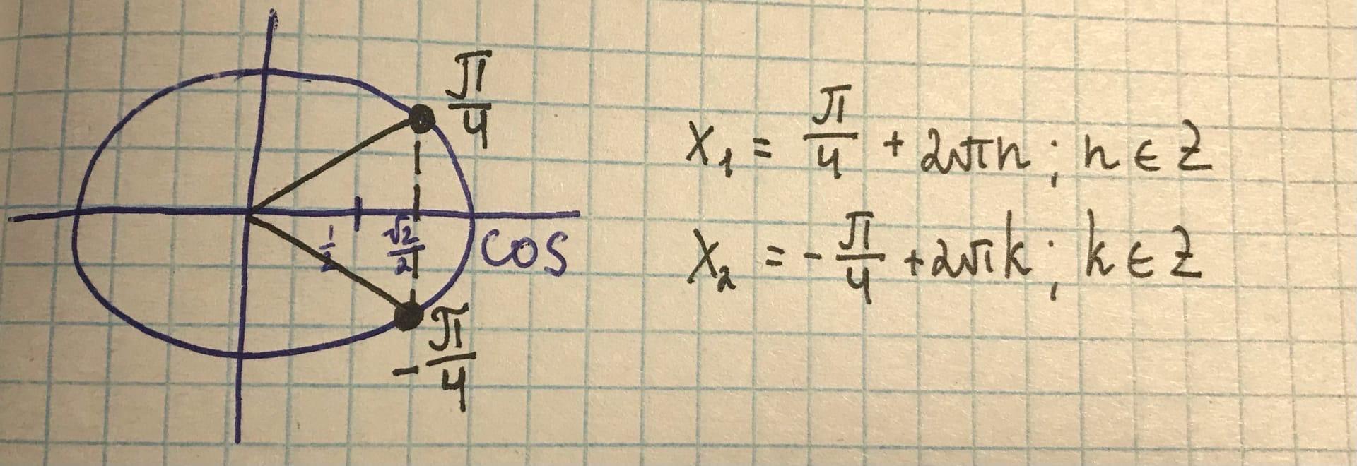 Рисуем тригонометрическую окружность. Ставим точку ✓2/2 на оси абцисс. Косинус - четная функция, поэтому: