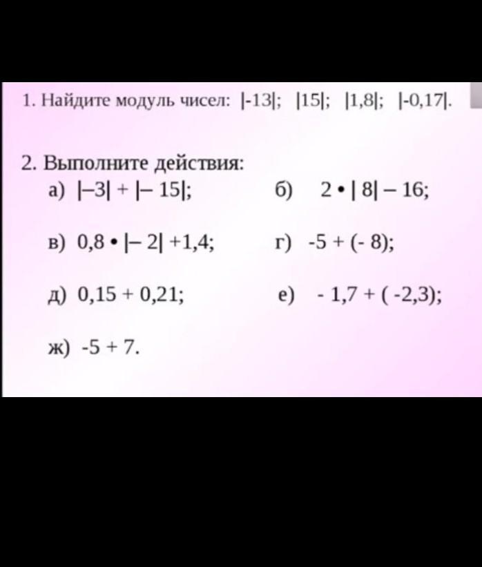 Найдите модуль: |‐13|; |15|; |1,8|; |‐0,17|. 2. Выполните действия . Пж Пж Пж помогите