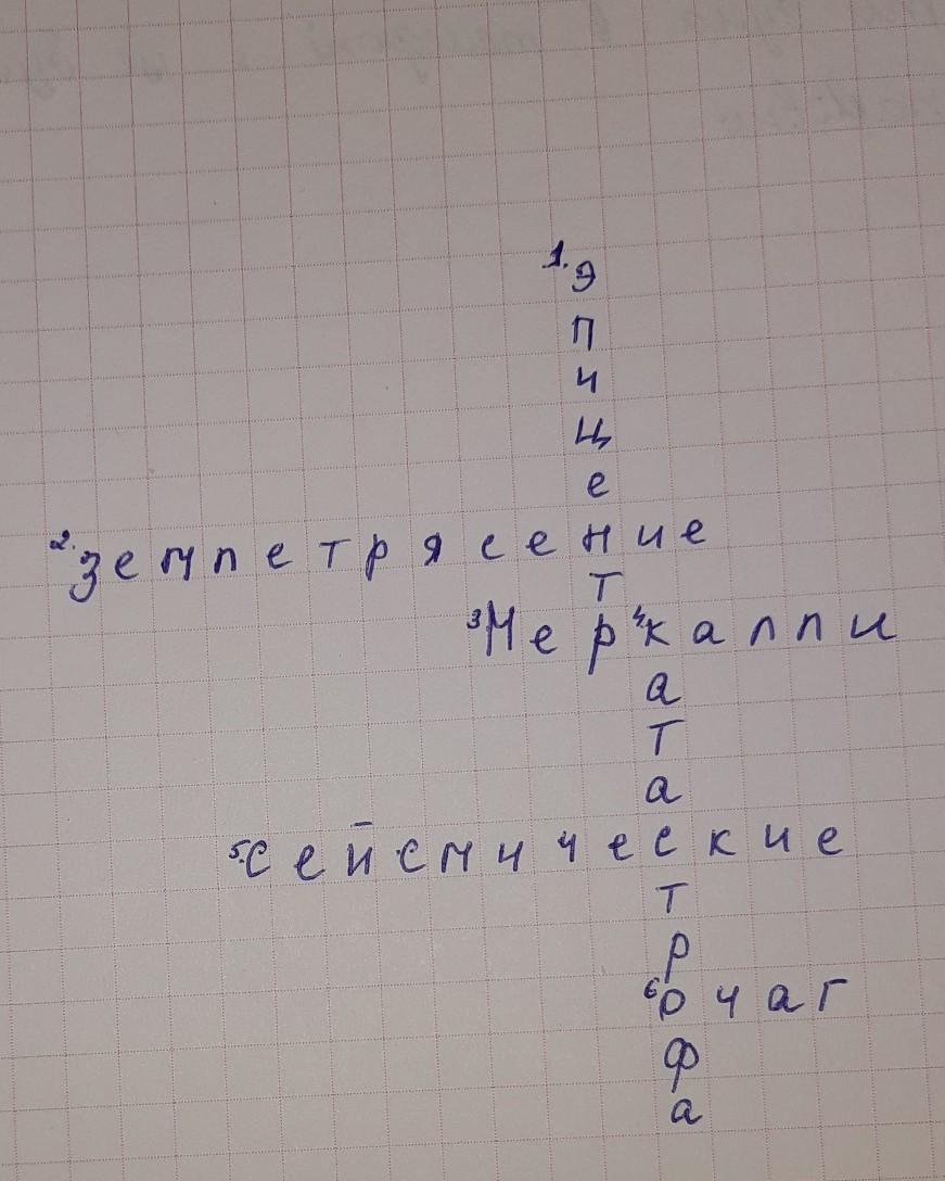 Срочно помогите составить кроссворд по ОБЖ со словами:Эпицентр,землетрясение,очаг,Меркалли,катастрофа,сейсмические!