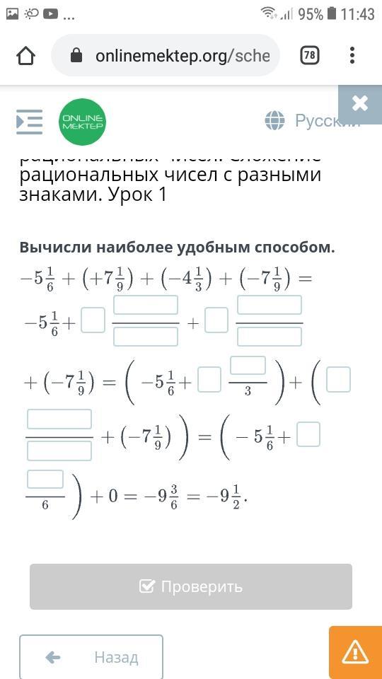 -5 1\6 + (7 1\9) + (-4 1\3) + (-7 1\9) = -5 1\6 + -4 1\3 + 7 1\9 + (-7 1\9) = (-5 1\6 + -4 1\3) + (7 1\9)+ (-7 1\9)) = ( -5 1\6 + -4 2\6 ) + 0 = -9 3\6 = -9 1\2