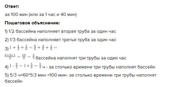 5) 5/3 ч=60*5:3 мин =100 мин- за столько времени три трубы наполнят бассейн