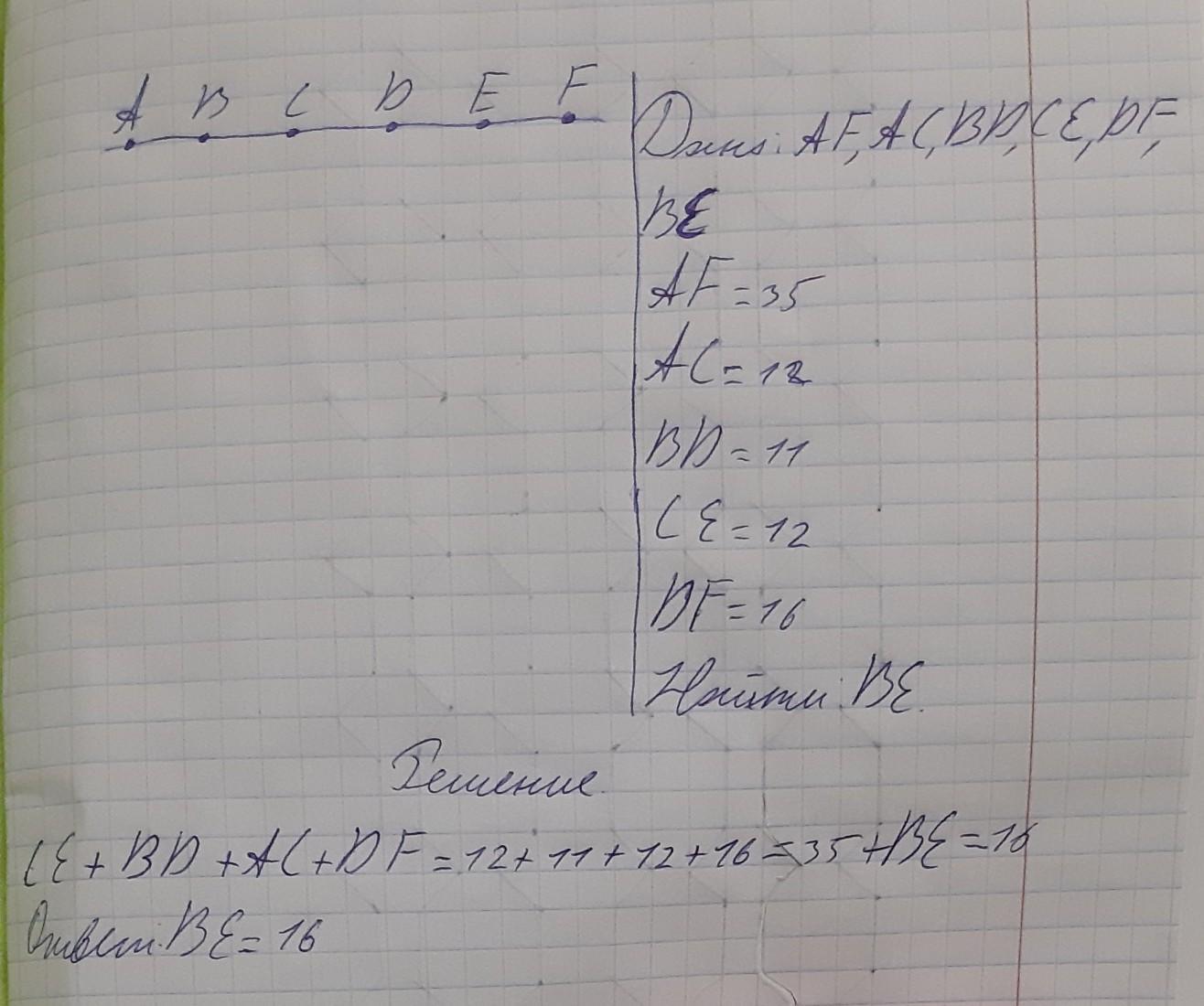 Помогите пж!!! Точки А Б С Д Е Ф размещенные на одной прямой в одному порядку. Знаем что: AF=35cm BD=11cm AC=12cm CE=12cm DF=16cm нужно найти расстояние между В и Е