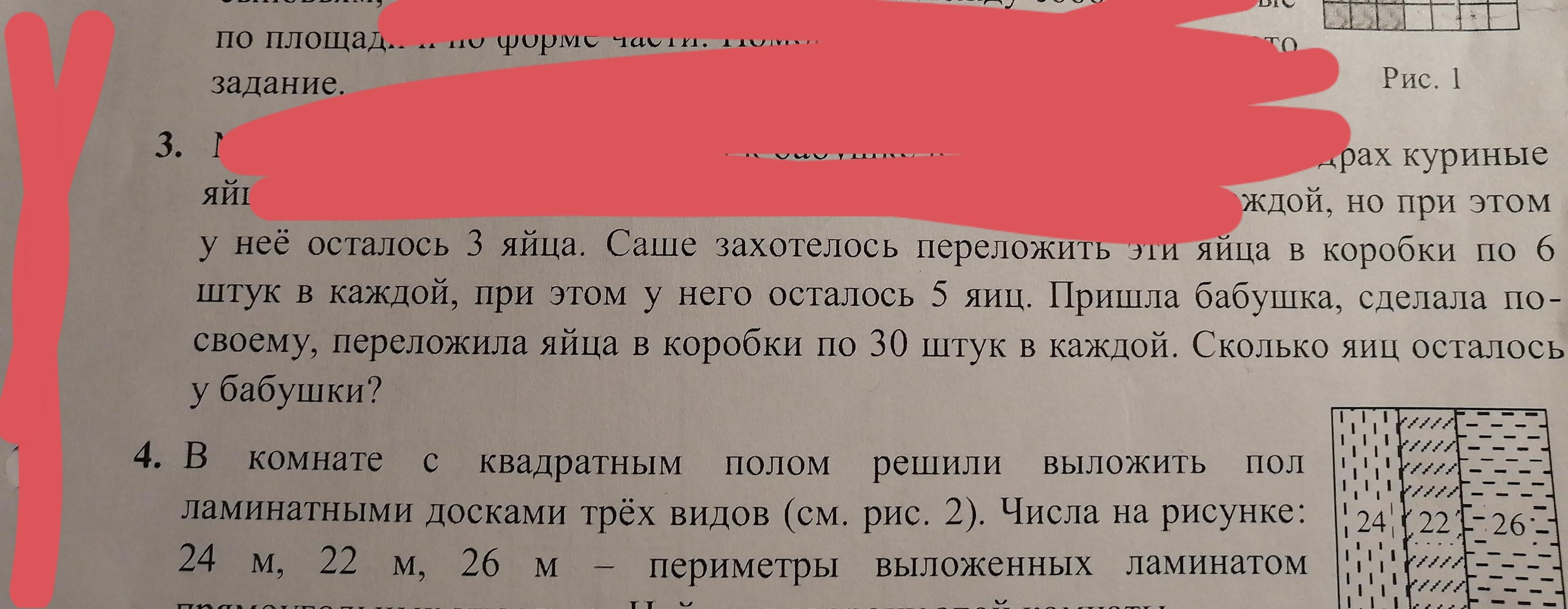 Маша и Саша приехали в гости к бабушке в деревню увидели в ведрах куриные яйца. Маша разложил по 5 штук в каждой коробке, но при этом у неё осталось 3 яйца. Саша разложил по 6 штук в каждой коробке, но при этом у него осталось 5 яиц. Пришла бабушка и сделала по своему, переложила по 30 штук в каждой коробке. Сколько яиц осталось у Бабушки
