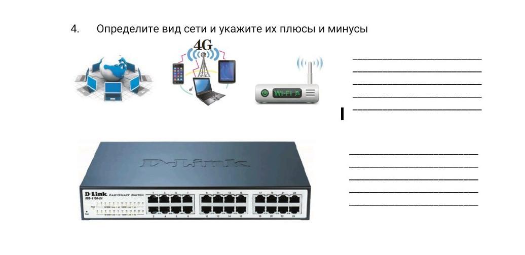 На картинке указано 4 типа сети: локальная проводная, сеть 4G (LTE), WI-FI, на нижней картинке указан свитч (для соеденений по локальной сети)