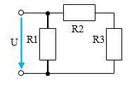 1. В указанной схеме определите ток источника, если U = 30 В; R1 = 8 Ом R2 = R3 = 4 Ом