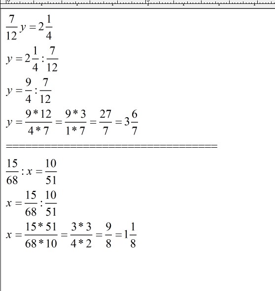 7/12y=2 1/4 и 15/68:x=10/51 решите уровнение