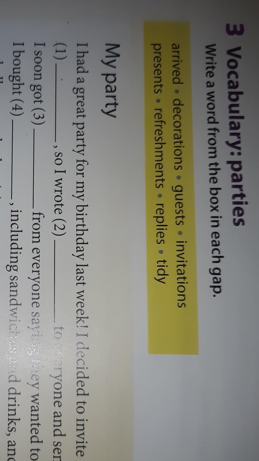 , including sandwiches and drinks, and I put up balloons and other (5) ..... . The party started and everyone (6) ..... on time. I got some great (7) .... from my friends, and some of them even offered to help (8) ....... up the next day!