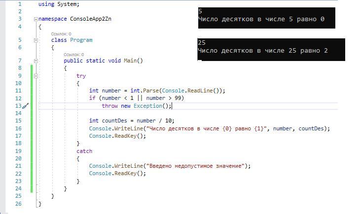 НА ЯЗЫКЕ С#. Составить программу, которая по введённому числу (от 1 до 99) определяет, сколько в нем десятков (5-нет десятков, 15-один десяток, 55-пять десятков).