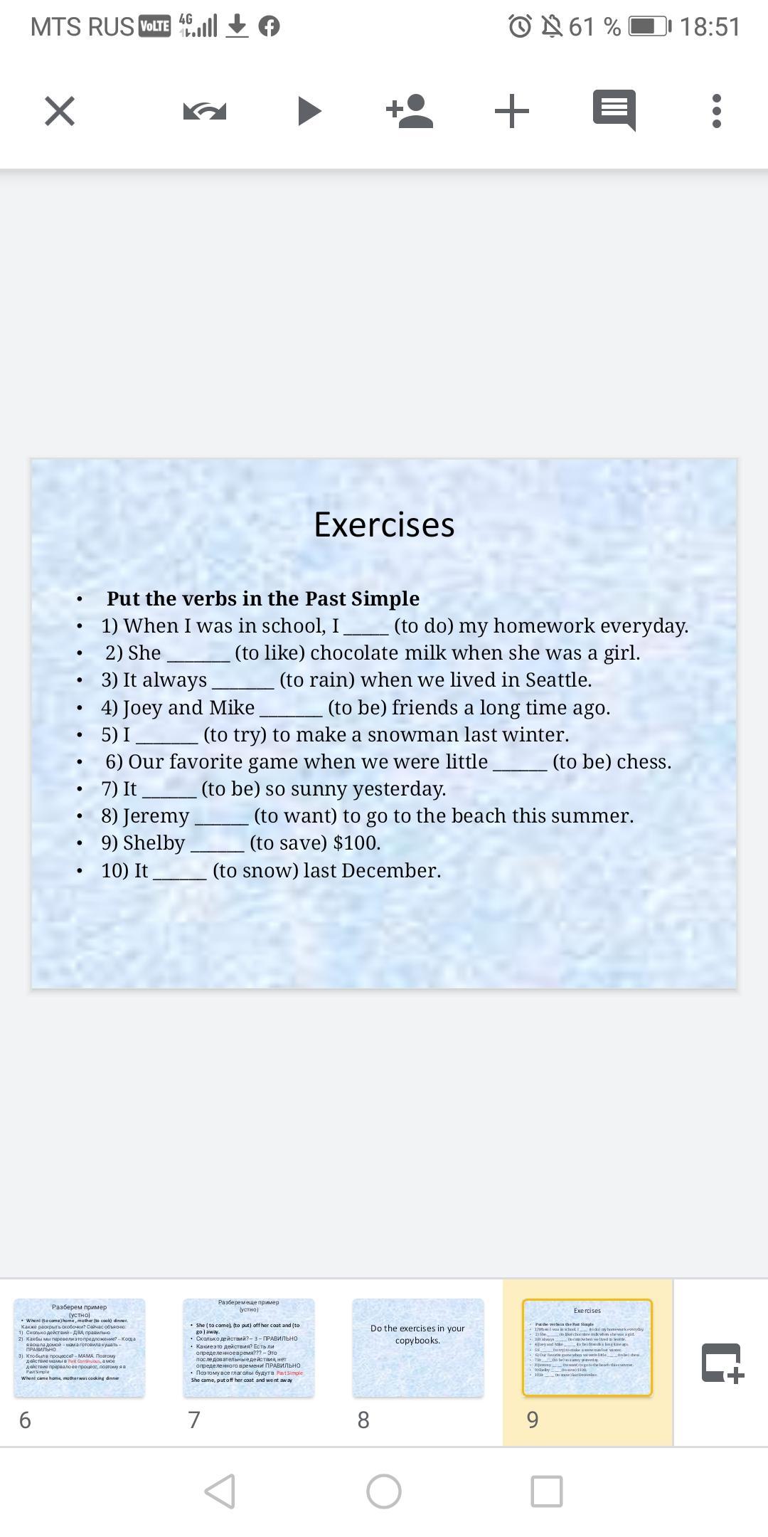 Ответ: 1) When I was in school, I did my homework everyday. 2) She liked chocolate milk when she was a girl. 3) It always rained when we lived in Seattle. 4) Joey and Mike were friends for a long time ago. 5) I tryed to make a snowman last winter. 6) Our favourite game when we were litlle was chess. 7) It was so sunny yesterday. 8) Jeremy wanted to go to the beach last summer. 9) Shelby save 100$ (One hundred dollars). 10) It snowed last December.