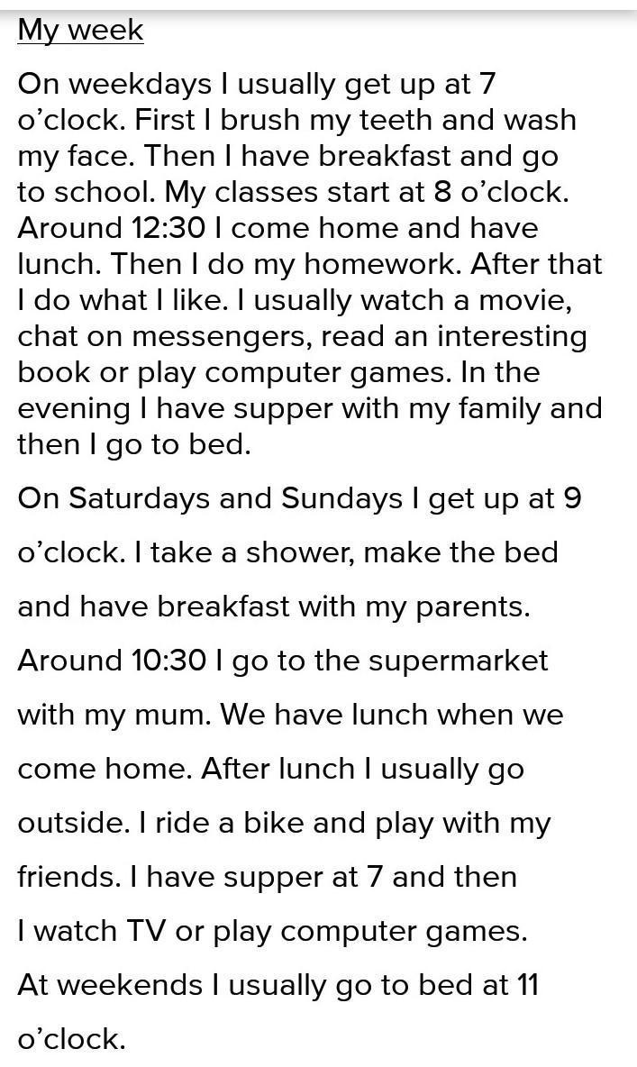 сделать сочинение на английском языке шесть семь предложений на тему того что ты делаешь целую неделю