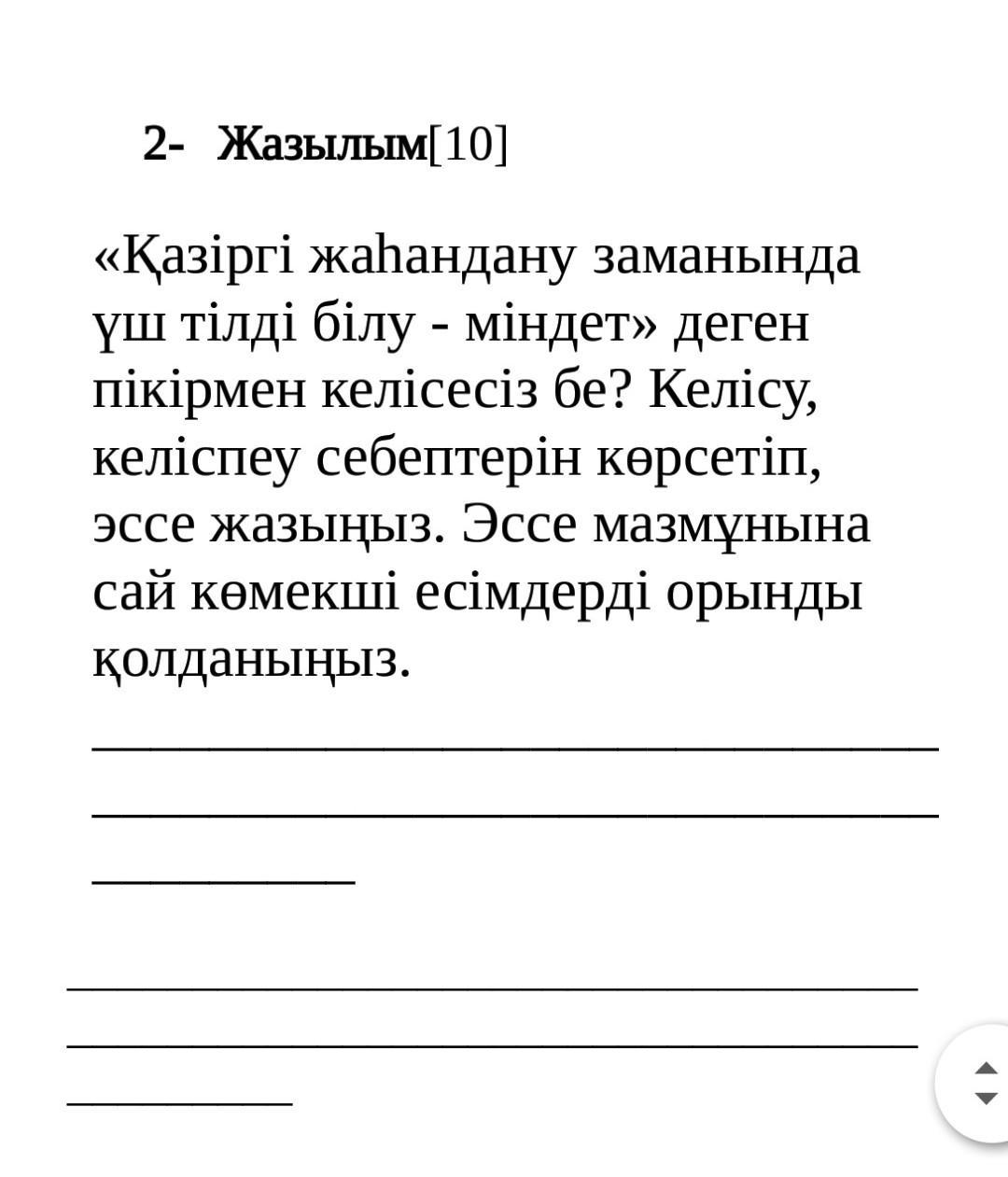 Қазіргі заманда 3 тілді меңгеру қажет. Себебі білім ешқашан артық болмайды. Қазақтар- "өзге тілін бәрін біл, өз тілінді құрметте" деген. Ағылшын тілін білу, орыс тілін білу өте маңызды. Шетелге барғанда, бір жақта Ағылшын компанияларымен жұмыс жасасаң Ағылшын тілі керек болады. Орыс тілін білу де маңызды. Себебі Қазақстанда орыстар өте көп. Солармен қарым-қатынас болу үшін Орыс тілі қажет болады. Қазіргі жаһандану заманында үш тілді білу- міндет. Дегенге келісемін