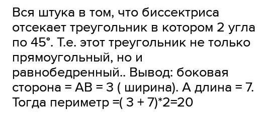 Бісектриса кута прямокутника АВСD ділить сторону ВС на відрізки 3 см і 4 см починаючи від вершини С. Знайдіть периметр прямокутника.