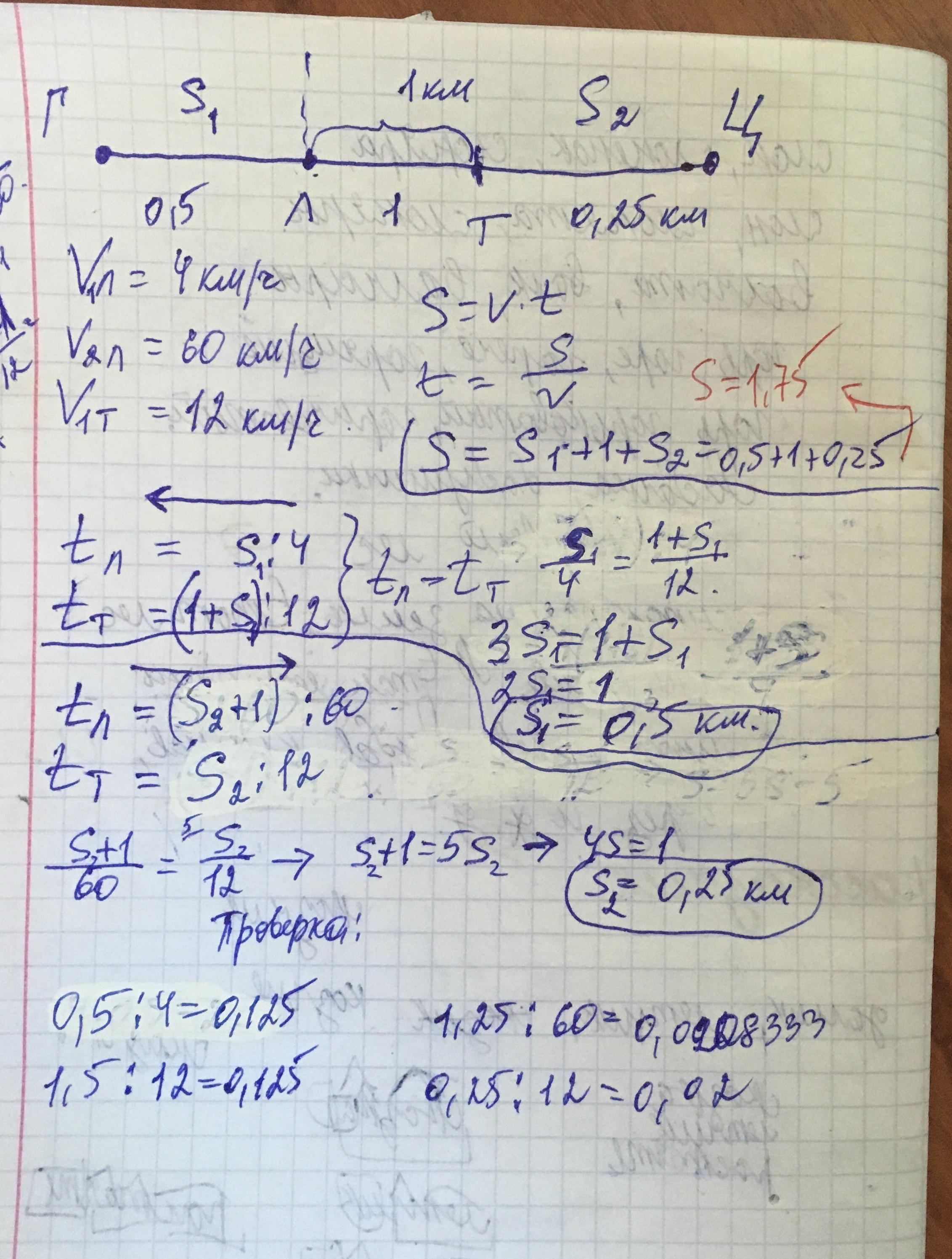 Города Гочино и Цареградцево соединены прямой дорогой. На дороге стоят Лоля и Толя, между ними 1 км. Лоля ближе к Гочино. Она ходит со скоростью 4 км/ч и ездит на велосипеде со скоростью 60 км/ч. Толя же бегает со скоростью 12 км/ч. Если ребята сейчас направятся в Гочино, то Лоля пешком доберётся туда одновременно с бегущим Толей. Если же ребята направятся в Цареградцево, Лоля на велосипеде доберётся туда одновременно с бегущим Толей. Каково расстояние между городами? Скажите плиз с пошаговым решением очень надо
