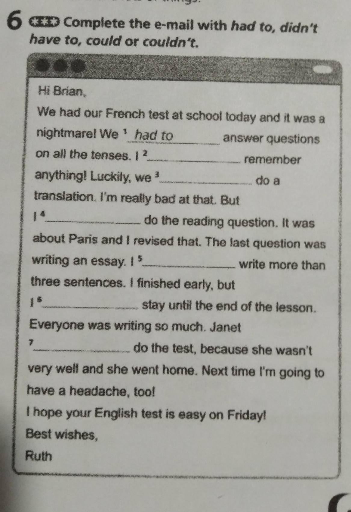 2)couldn’t3)had to4)could5)couldn’t6)had to7)didn’t have to