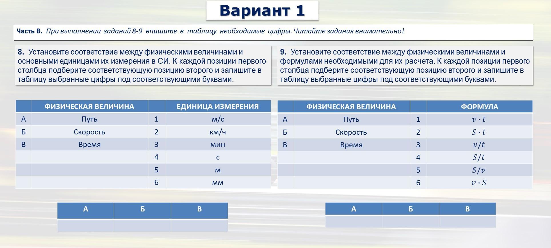 Установите соответствие между физическими величинами и основными единицами их измерения в СИ. К каждой позиции первого столбца подберите соответствующую позицию второго и запишите в таблицу выбранные цифры под соответствующими буквами.