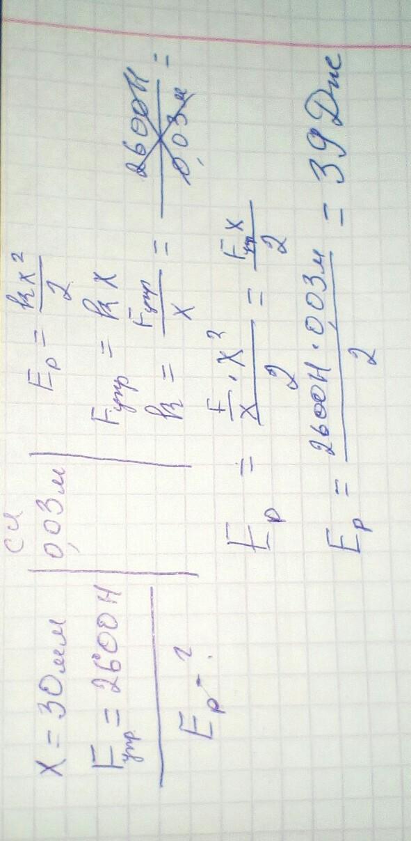 Визначте потенціальну енергію пружини стиснутої на 30 мм силою 2600 Н і дано будь ласка