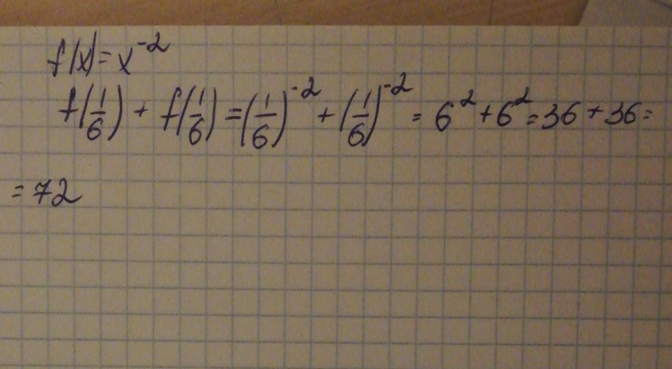 одна шестая это x, а нам функция задана формулой f от х равна х в минус второй степени , значит f от одной шестой будет равен одной шестой в минус второй степени , дальше решаем полученное выражение