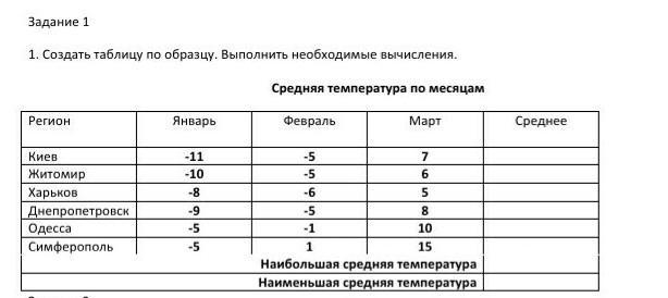 Создать таблицу по образцу.Выполнить необходимые вычисления.Средняя температура по месяцам