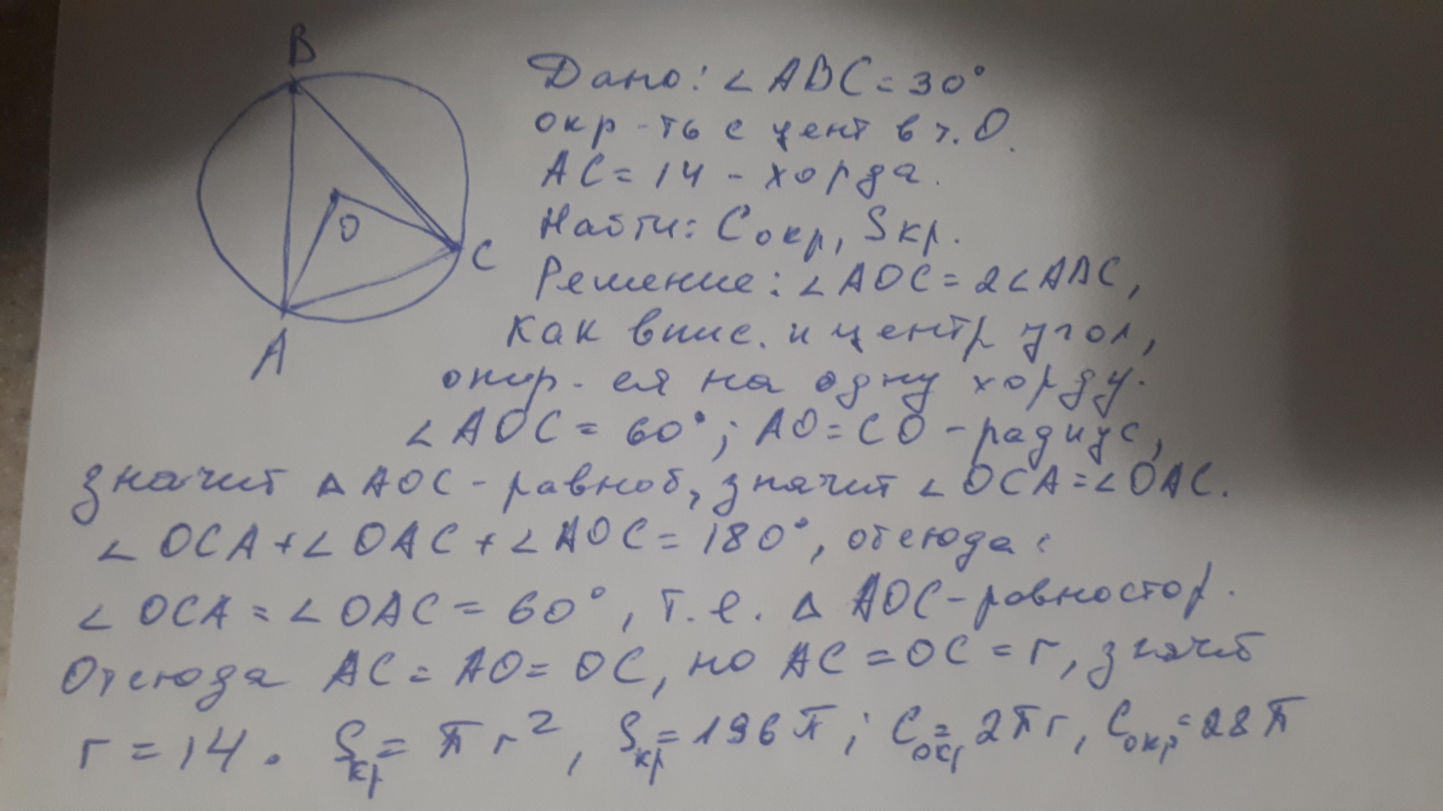 Вычислите площадь круга и длину окружности, если хорда равна 14, а опирающийся на нее вписанный угол равен 30°.