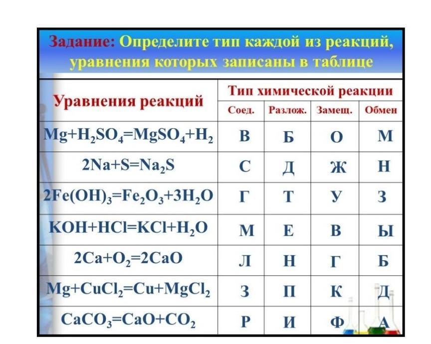 1- замещение, 2соединение, 3 разложение, 4 обмен, 5 соединение, 6 замещение, 7 разложение