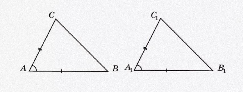 Если две стороны и угол между ними одного треугольника соответственно равны двум сторонам и углу между ними другого треугольника, то такие треугольники равны (на фото)