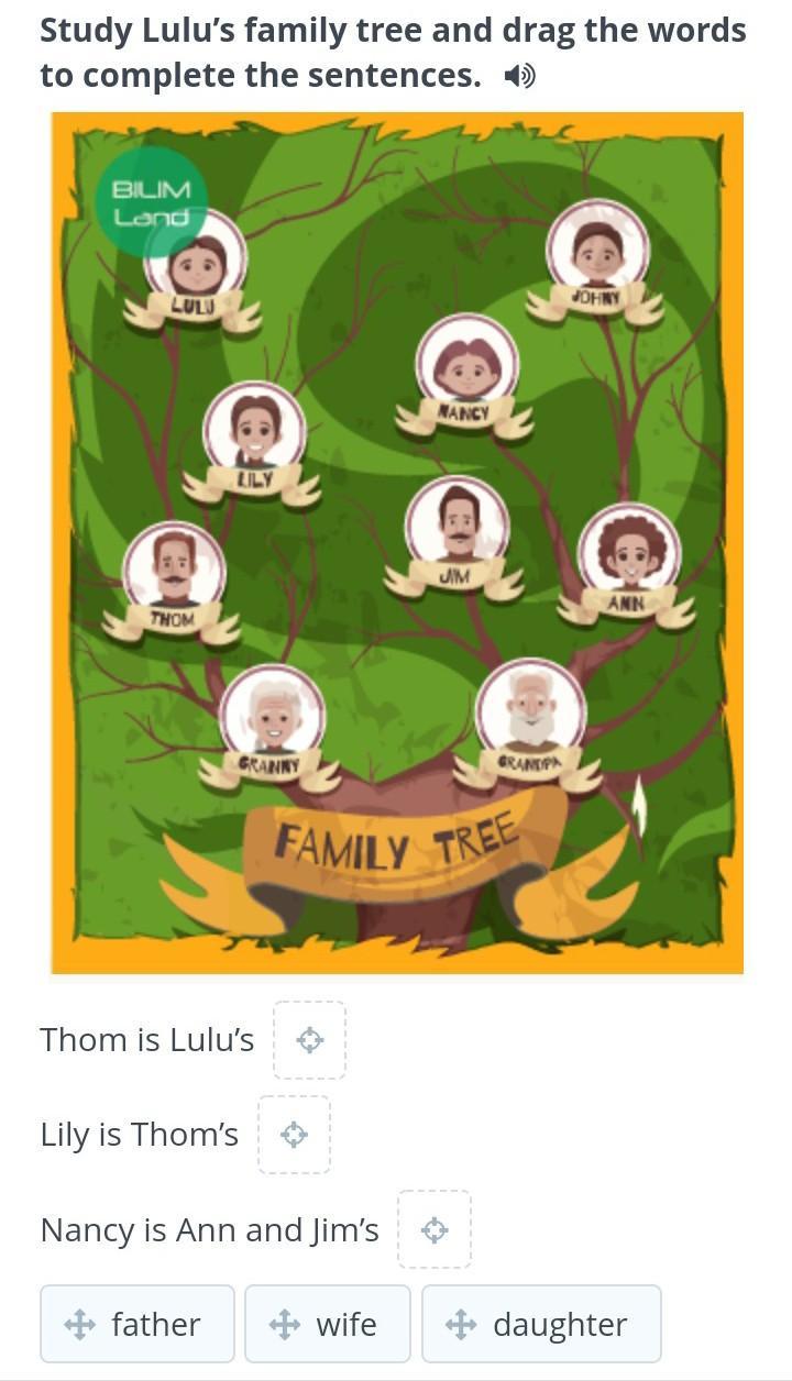 Study Lulu’s family tree and drag the words to complete the sentences.
