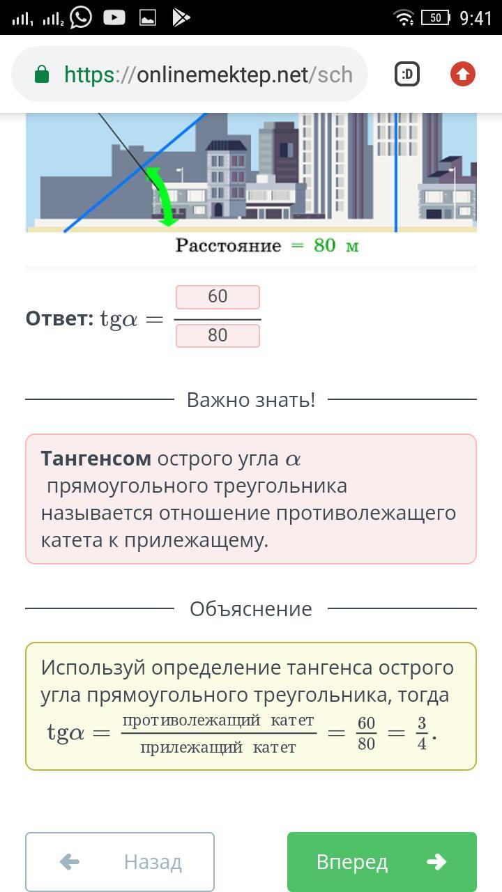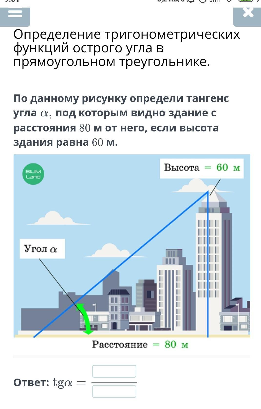tgα=противолежащий катет на прилежащий, т. е. tgα=60/80=0,75
