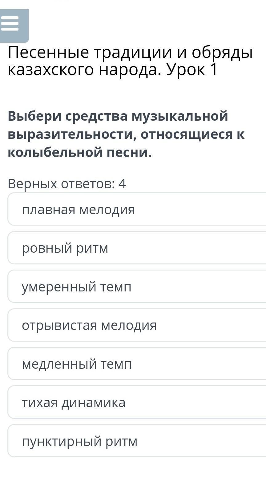Выбери средства музыкальной выразительности, относящиеся к колыбельной песни.