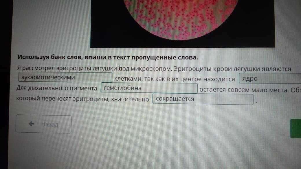 Я рассмотрел эритроциты лягушки под микроскопом. Эритроциты крови лягушки являются эукариотическими клетками, так как в их центре находится ядро . Для дыхательного пигмента гемоглобин остается совсем мало места. Объем кислорода, который переносят эритроциты, значительно сокращается.