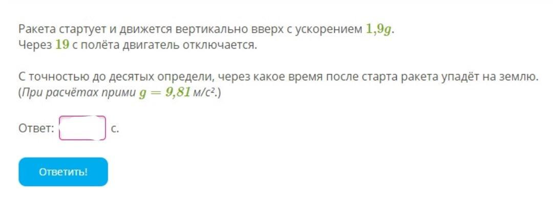 V = at = 1.7*9.8*19 = 316,54 м/с.