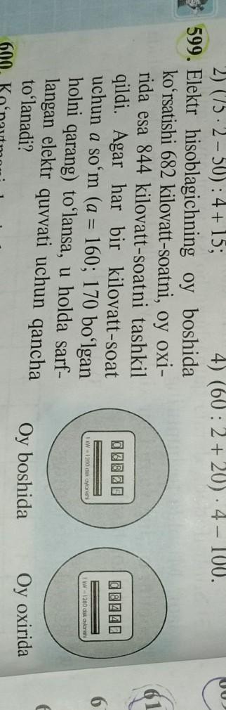 599.В начале месяца счетчик электроэнергии показывал 682 киловатт-часа, а в конце месяца - 844 киловатт-часа.Если сумма выплачивается за каждый киловатт-час (см. A = 160 170) сколько платят за электричество