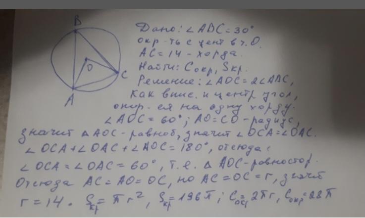 Вычислите площадь круга и длину окружности, если хорда равна 14, а опирающийся на нее вписанный угол равен 30°. С решением