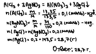 Вычислите массу хлорида серебра полученного при взаимодействии хлорида алюминия массой 13.35 г и нитрата серебра массой 34 г