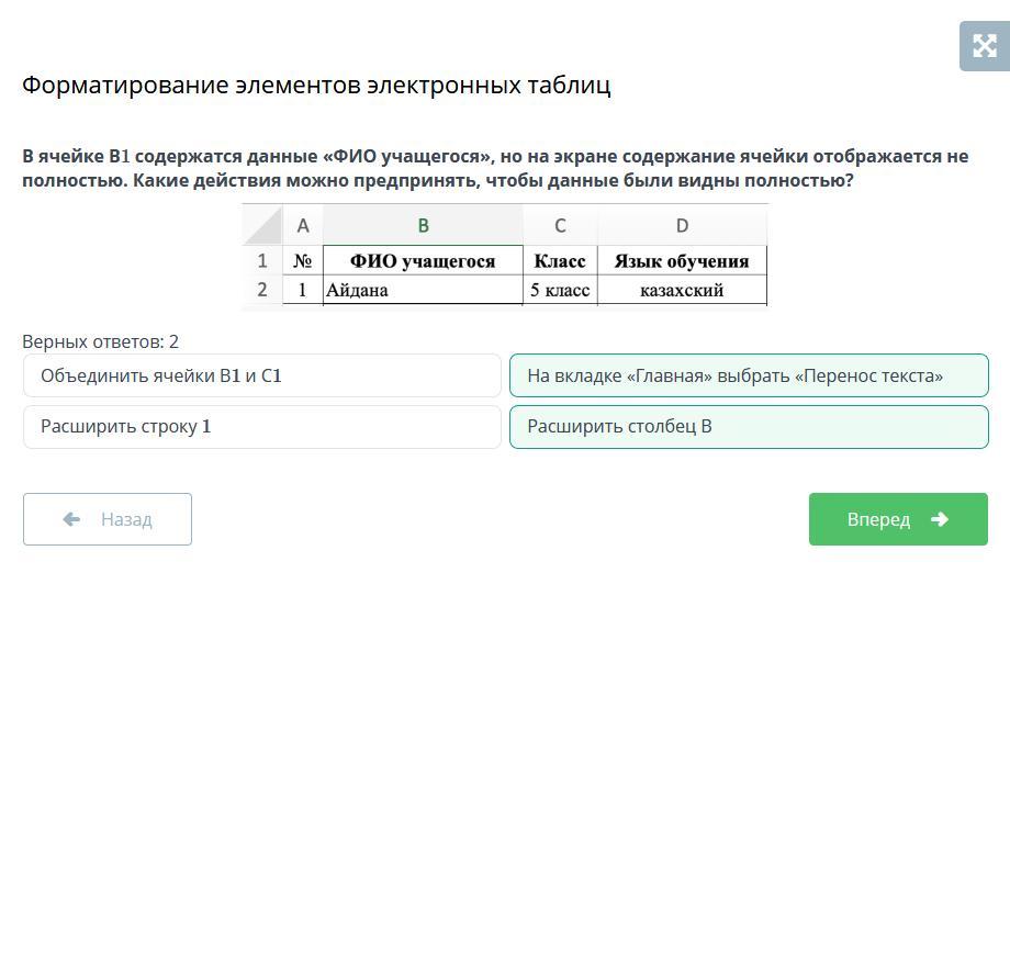 В ячейки В1 содержится данные ФИО учащегося, но на экране содержание ячейки отображается не полностью. Какие действия можно предпринять, чтобы данные были видны полностью?