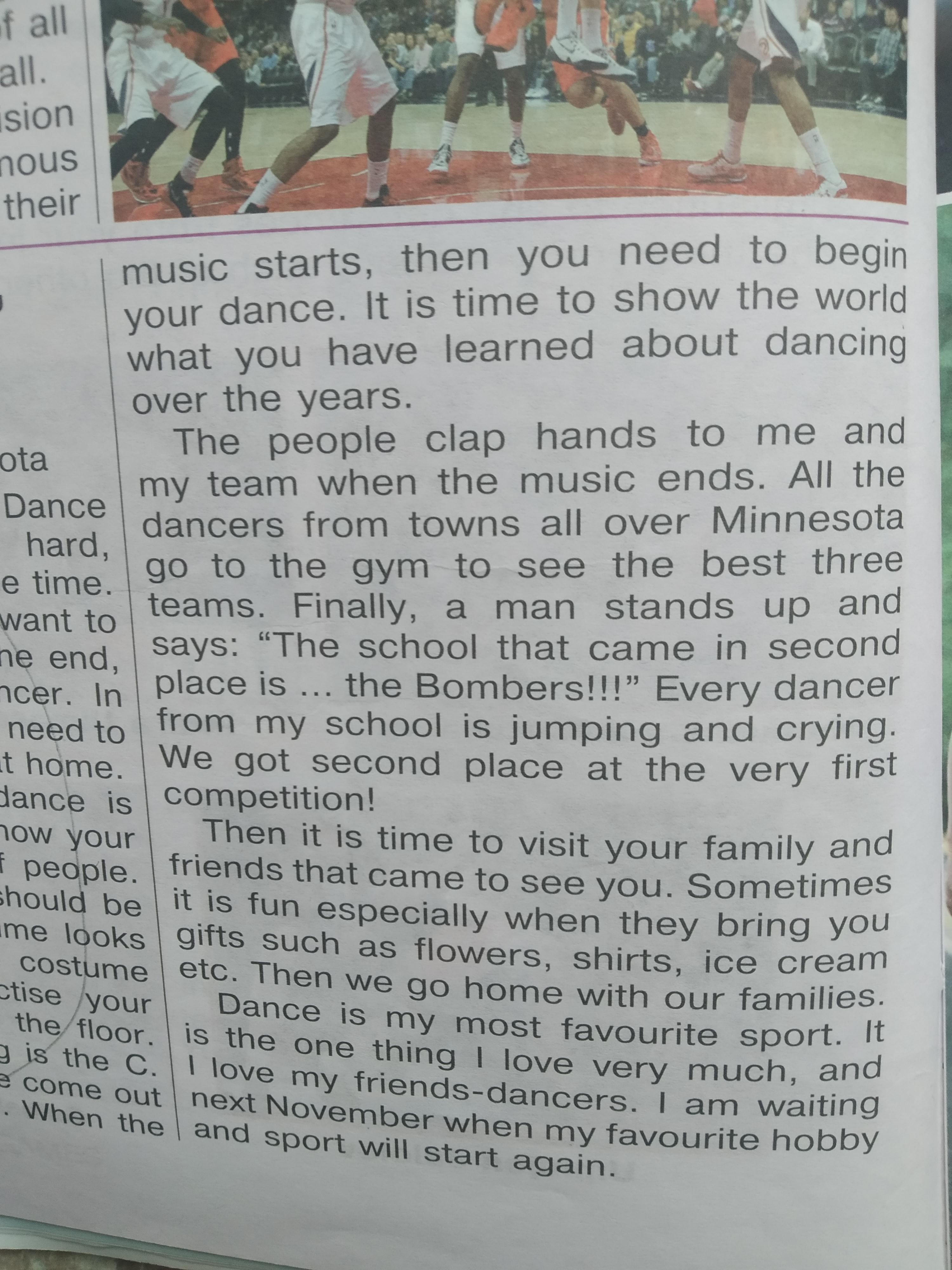 Когда музыка заканчивается, люди хлопают в ладоши мне и моей команде. Все танцоры со всей Миннесоты идут в спортзал, чтобы увидеть лучшие свои команды. Наконец, мужчина встает и говорит: «Школа, занявшая второе место. На месте - бомбардировщики !!! Все танцоры из моей школы прыгают и плачут домой. Мы заняли второе место на самом первом.
