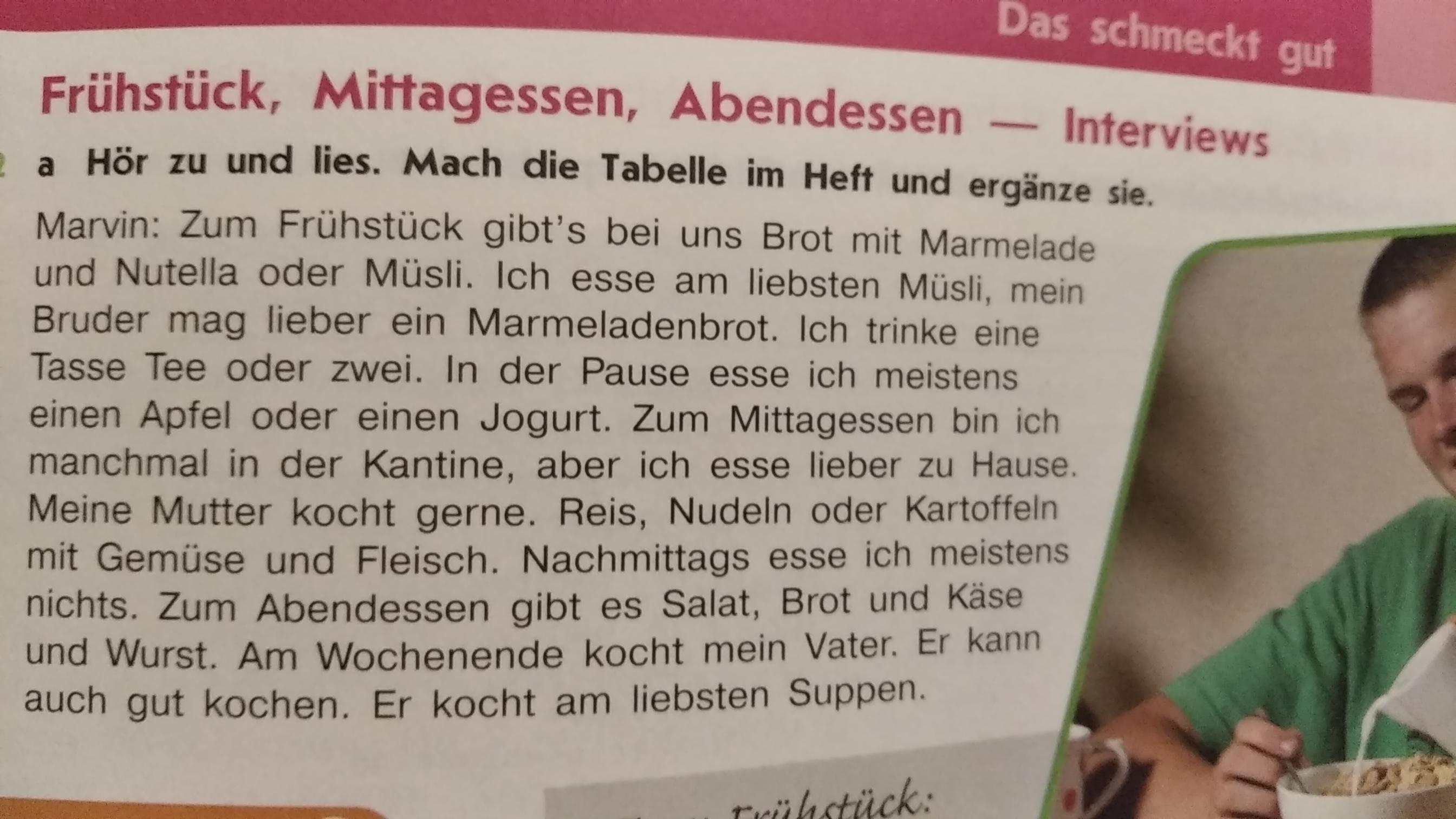 Цуум фрюштук гибтс беай унс брот мит мармэладе унд нутела одер мюсл. Их эссе ам лиебстен мюсл, майн брудер маг лиебер айн мармеладенброт. Их тринке айне тассэ тии одер цвай . Ин дер паузе эссе их меистенс айнен апфль одер айнен Йогурт. Цум митагэссен бин их манхмаль ин дер кантине, абер их эссе лиебер цу хаусе.Майне муутер кохт герн. Райс, нуделн одер картофэин мит гемусе унд фляиш. нахмитагз эссе их майстенс нихт. Цум абендэссен гибт эс залат, брот унд казэ унд вюрст . Ам вохэенде кохт майн фатер. Эр кан аух гут кохэн. Эр кохт ам лиебстен зупэн.
