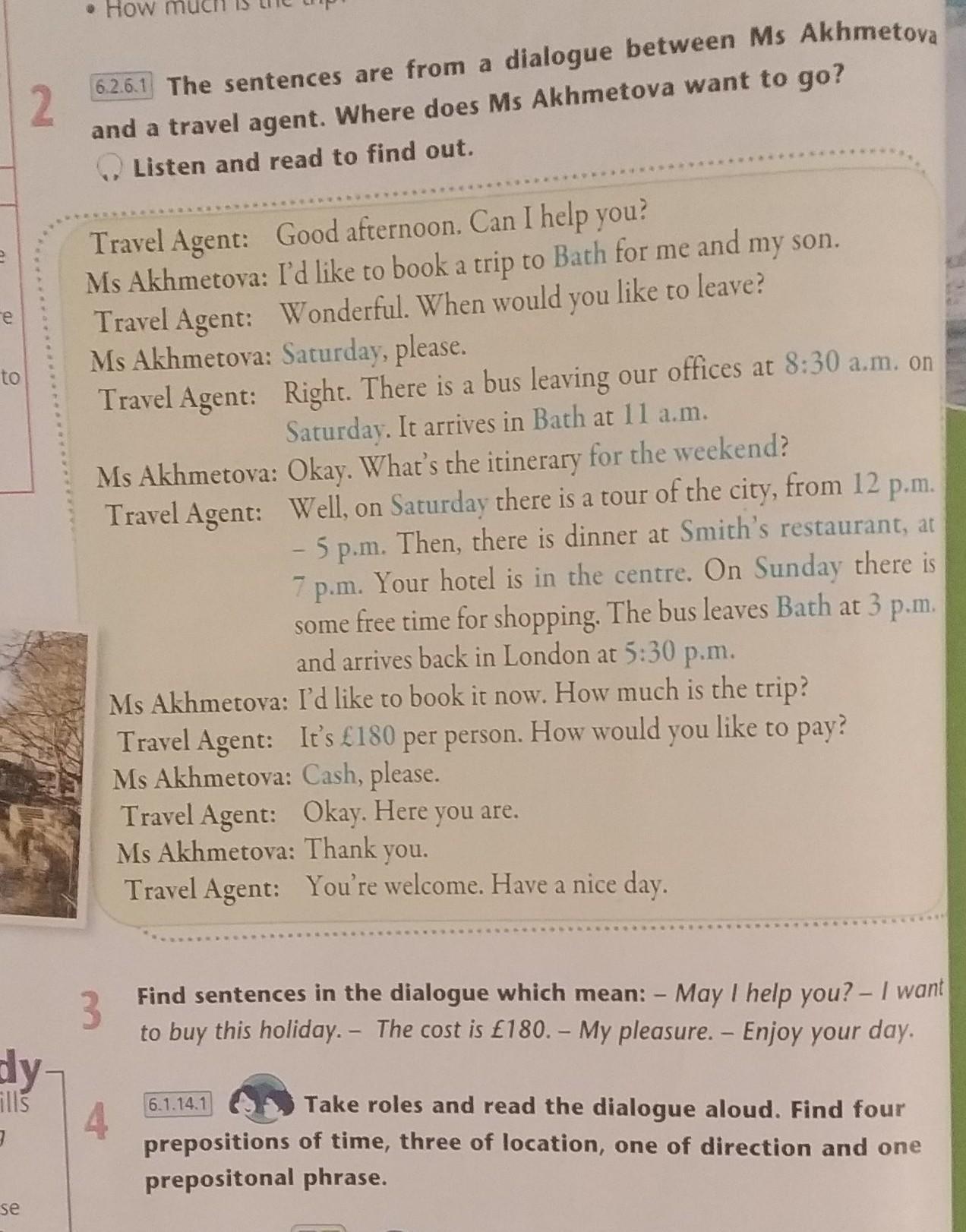 Take roles and read the dialogue aloud. Find four prepositions of time, three of location, one of direction amd one prepositional phrase.